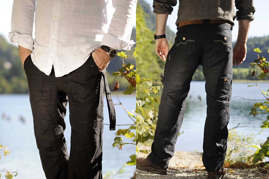 'Herrenhose Leinen lang Bio-Leinen Schwarz – Aufgesetzte Taschen mit Olivenholz Knöpfen und hand bestickt (vorne und rückw.) (Modell HC-ES-004)' | '2023-06-30 10:07:21'