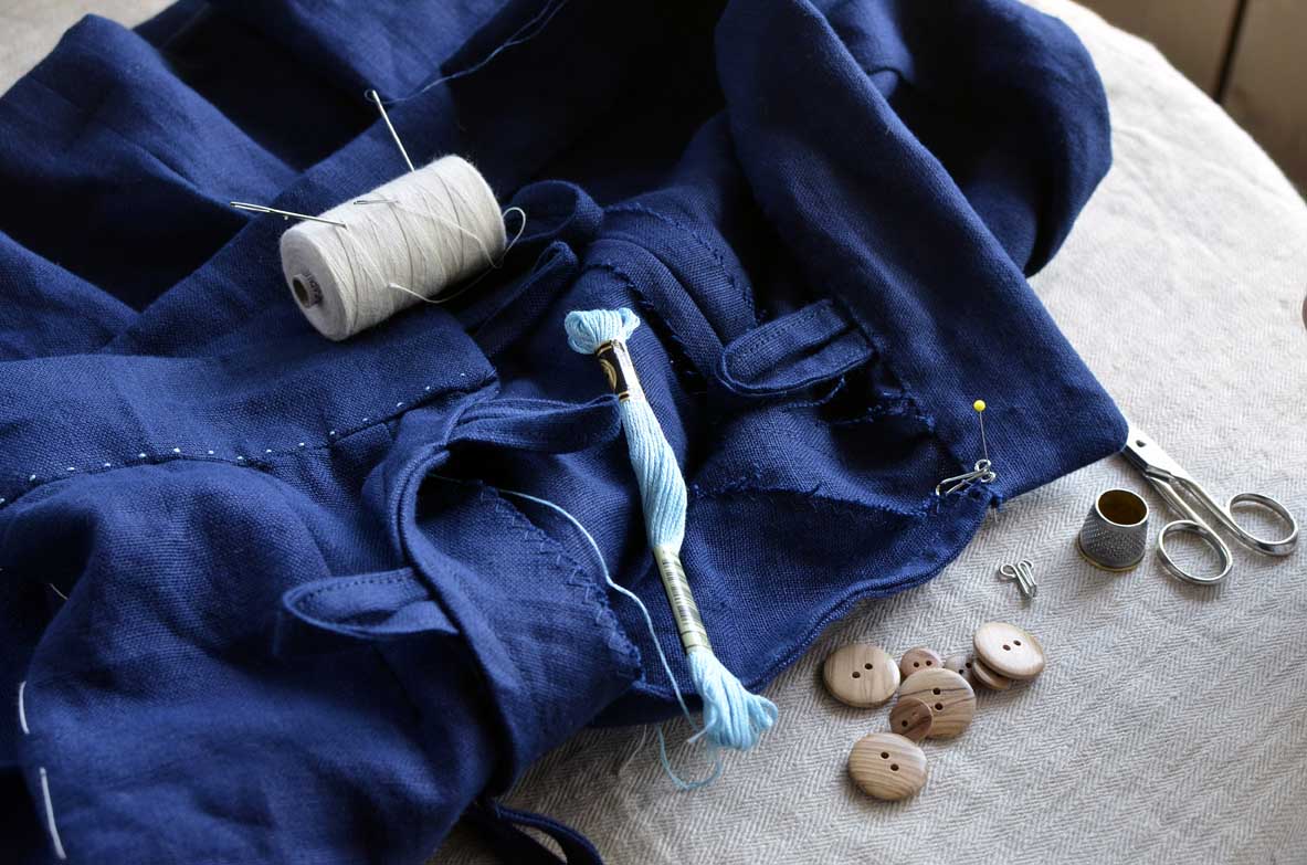 'Gonna blu in lino biologico, abbottonatura laterale con bottoni in legno d'ulivo, filo da ricamo ' | '2023-06-30 10:07:21'